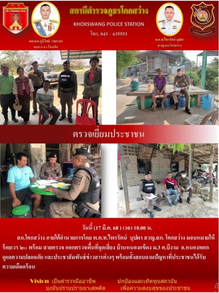 วันที่ (6 ก.พ. 68 ) เวลา08.00 น. โดยการอำนวยการ พ.ต.ท.ประวิทย์ จิตราษฎร์ สวญ.สภ.โคกสว่าง ,พ.ต...